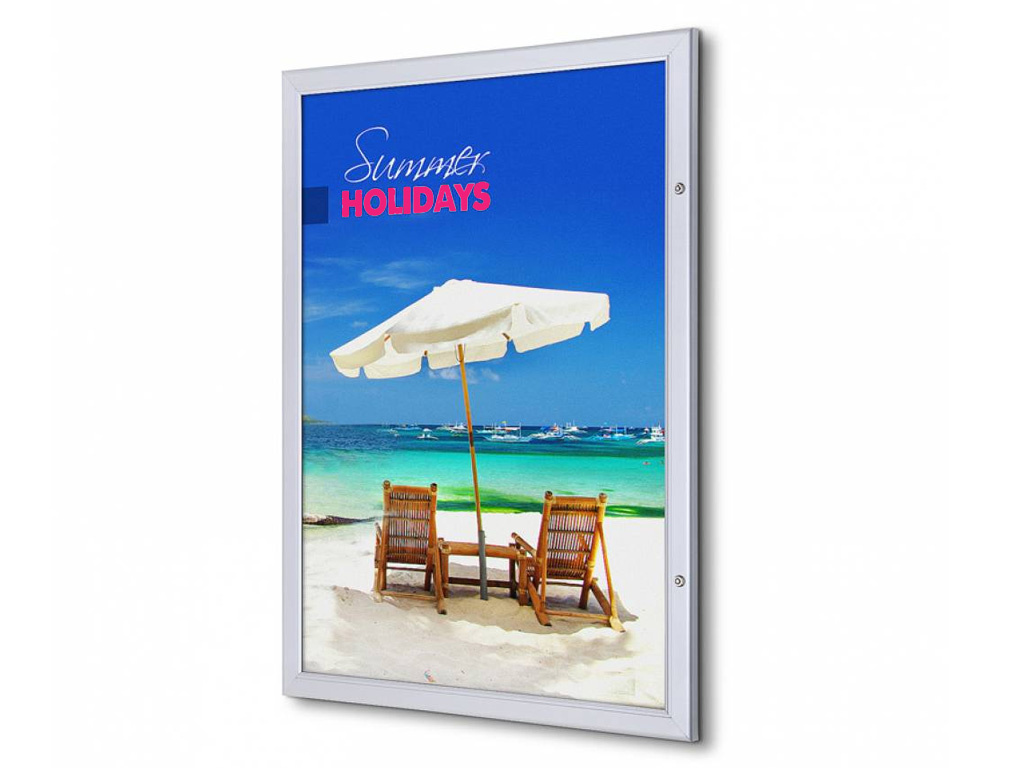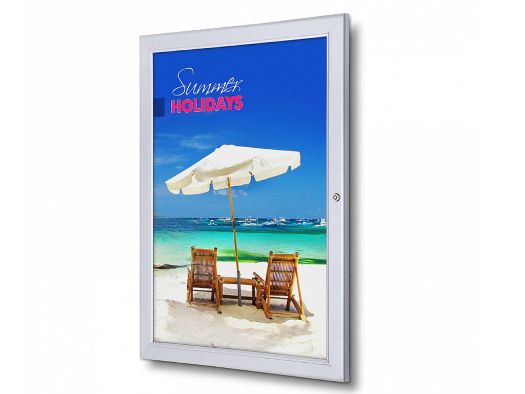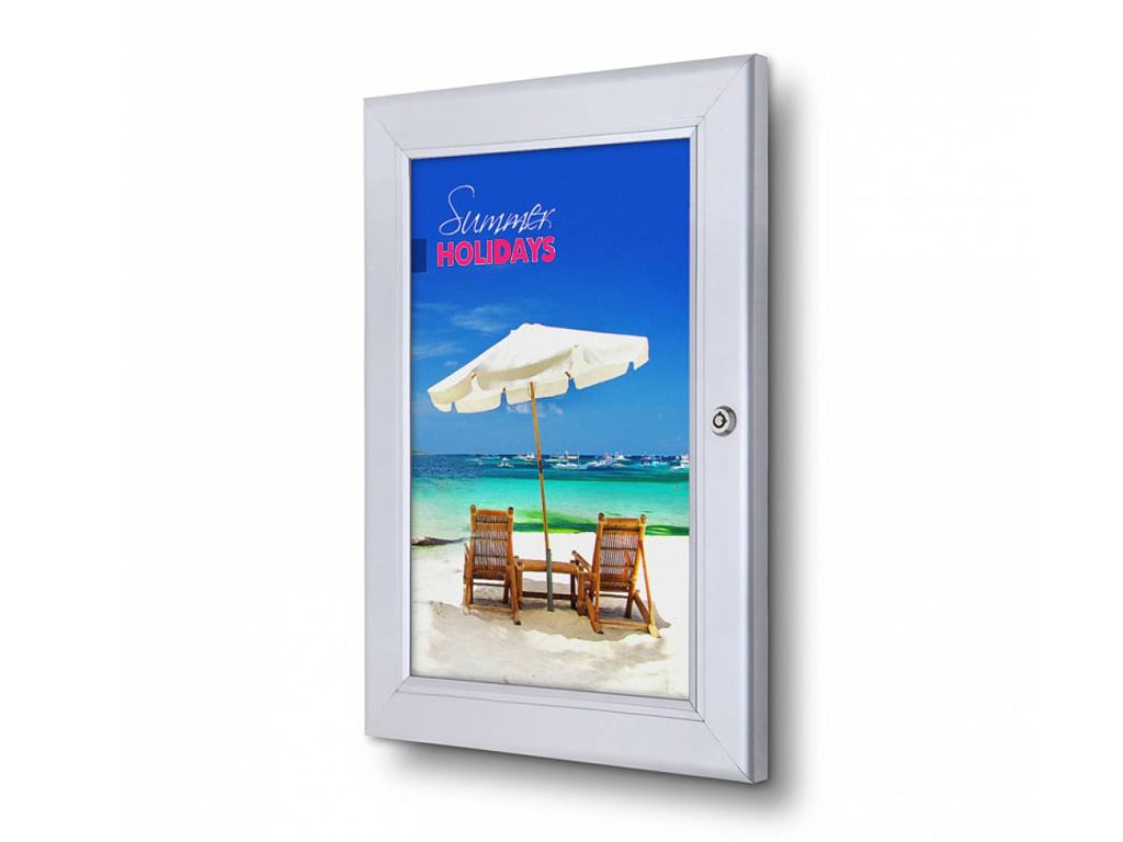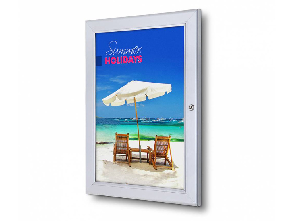 De afsluitbare postervitrine indoor biedt een duurzaam design voor een strakke budget prijs. Het is een kosteneffectieve keuze in ons assortiment de afsluitbare postervitrine indoor. Met een slanke zilveren afwerking heeft deze postervitrine een externe diepte van 23mm, dat is de afstand die de postervitrine van de wand uitsteekt. De binnen diepte voor het plaatsen van inhoud in de poster case is 4mm. Met zijn robuuste profielbreedte van 37mm. Deze postervitrine heeft een kunststof achterwand en een deur van polycarbonaat. Hierdoor is het een lichtgewicht en beslist een duurzame displayoptie. De rechte hoeken geven het design een super strakke look.