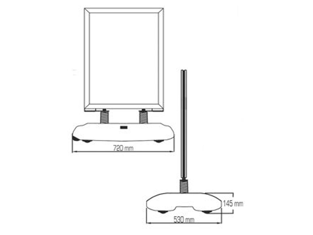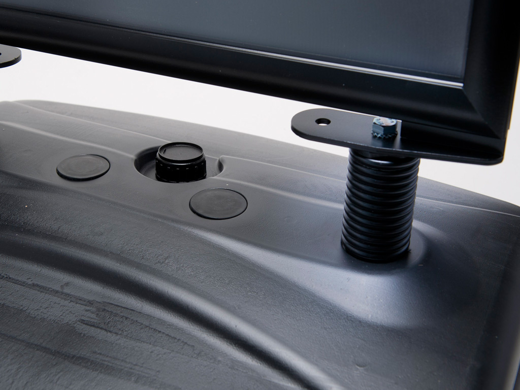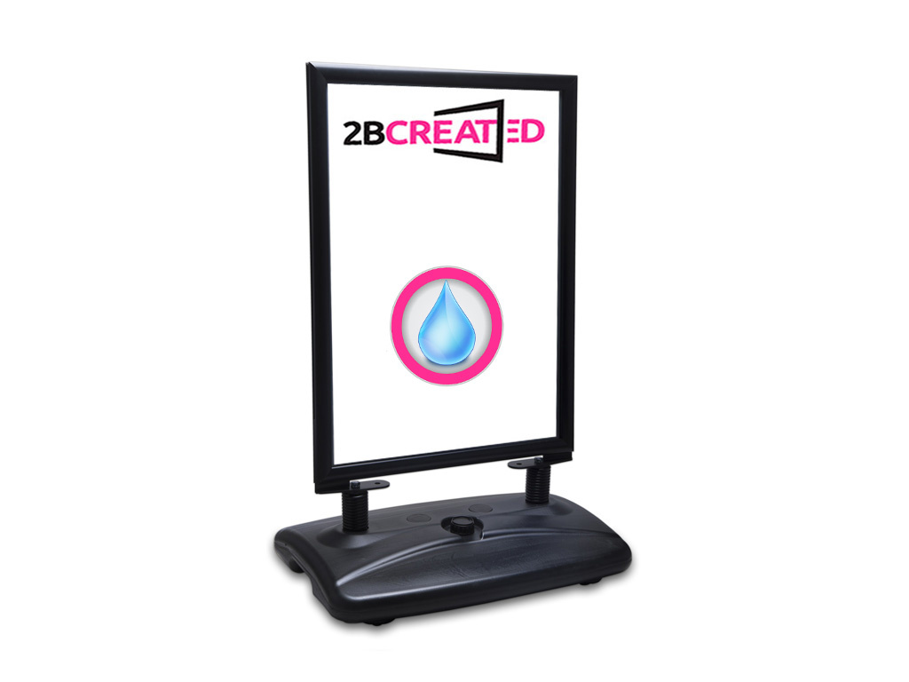 Stoepbord Buiten Zwart is geheel in het zwart uitgevoerd met waterbase. Flexibel in de wind door 2 stevige veren, waterdicht uitgevoerd. Dubbelzijdige poster presentatie voorzien van klikprofielen. Makkelijk verplaatsbaar door 2 wieltjes.
